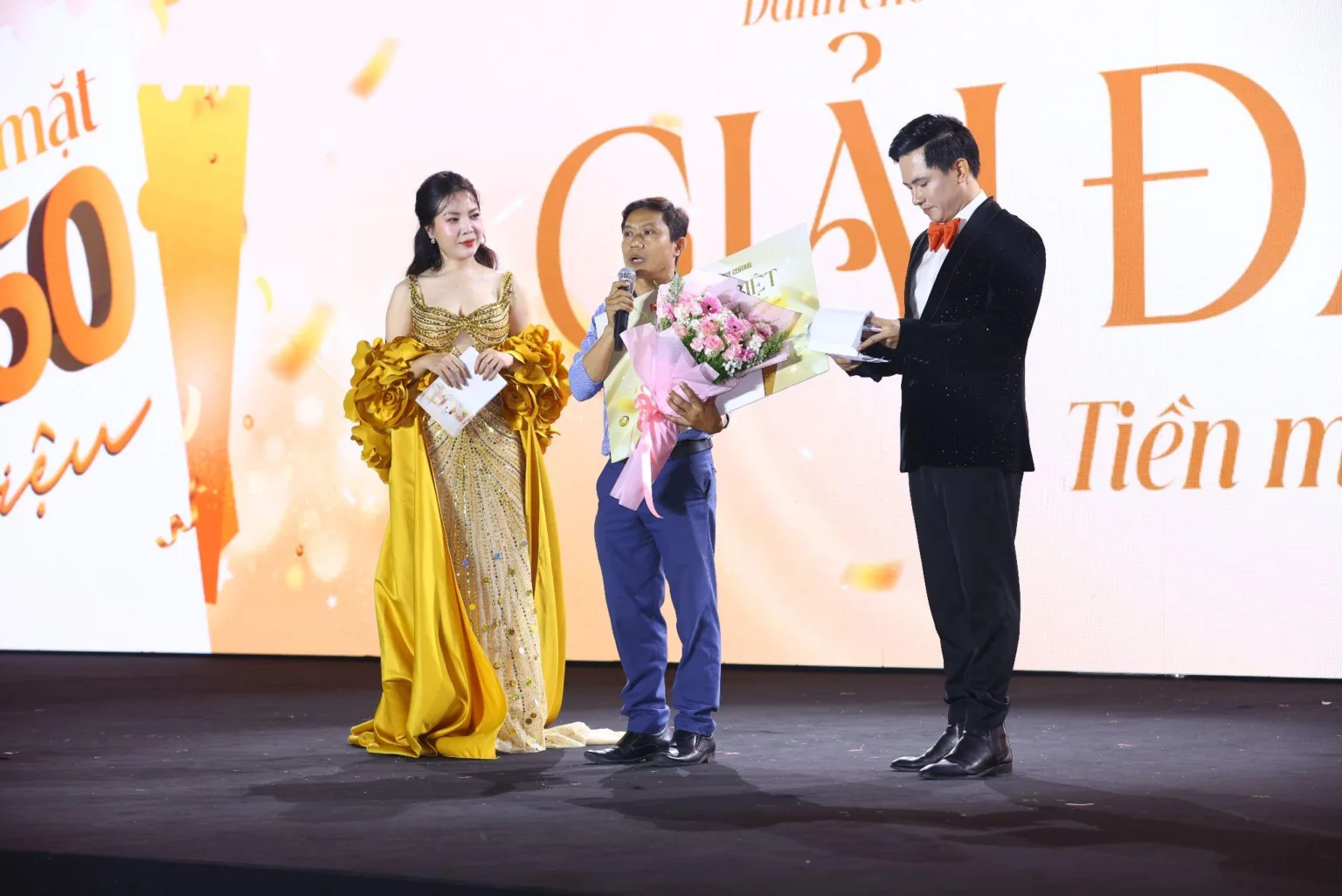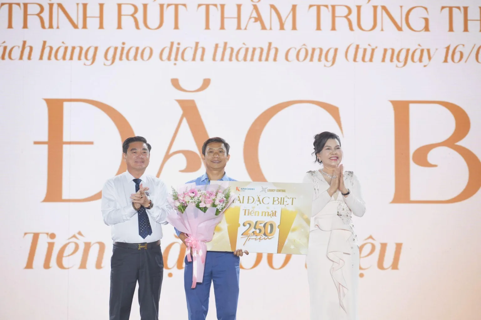 Bà Đặng Thị Kim Oanh và ông Nguyễn Thuận trao giải đặc biệt là 250 triệu đồng tiền mặt đến khách hàng Mai Hoàng Quân. Anh Quân chia sẻ: “Tôi thật sự bất ngờ và xúc động khi trở thành người may mắn nhận giải thưởng lớn này. Nhưng với gia đình tôi, điều quan trọng hơn là đã chọn đúng nơi an cư tại Legacy Central. Ngay từ đầu, tôi đã tin vào uy tín của Kim Oanh Land, và qua quá trình triển khai cũng như chất lượng căn hộ thực tế, niềm tin đó càng được củng cố. Giải thưởng hôm nay càng khẳng định niềm tin trọn vẹn hơn cho quyết định của tôi”.