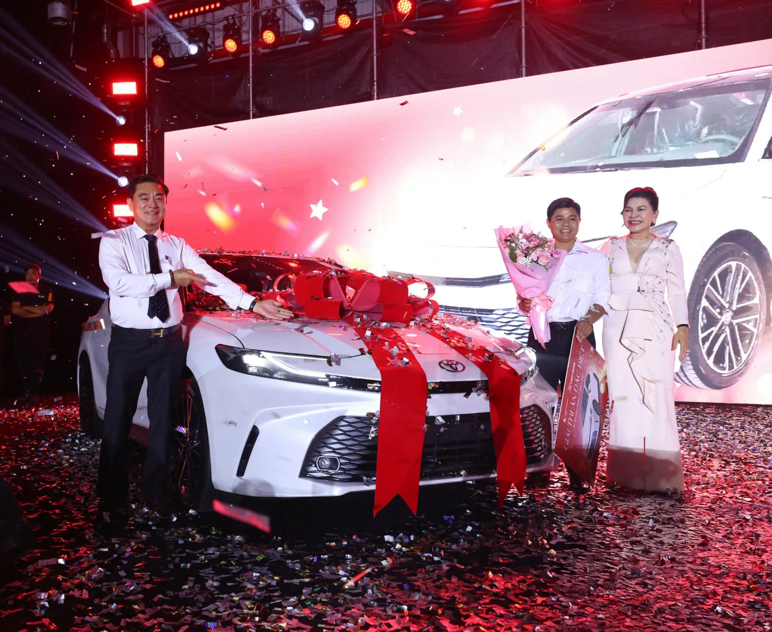 Điểm nhấn của Sự kiện là chương trình bốc thăm trúng thưởng với tổng giá trị giải thưởng lên đến 2,5 tỷ đồng như xe Toyota Camry 2.5HEV TOP, 250 triệu đồng tiền mặt, xe Honda SH, Honda Air Blade cùng nhiều quà tặng ý nghĩa khác. Trong ảnh: Bà Đặng Thị Kim Oanh và ông Nguyễn Thuận (bìa trái) – Phó Chủ tịch HĐQT Kim Oanh Group – trao giải Đặc biệt là chiếc xe Toyota Camry 2.5HEV TOP cho vị khách hàng may mắn nhất.