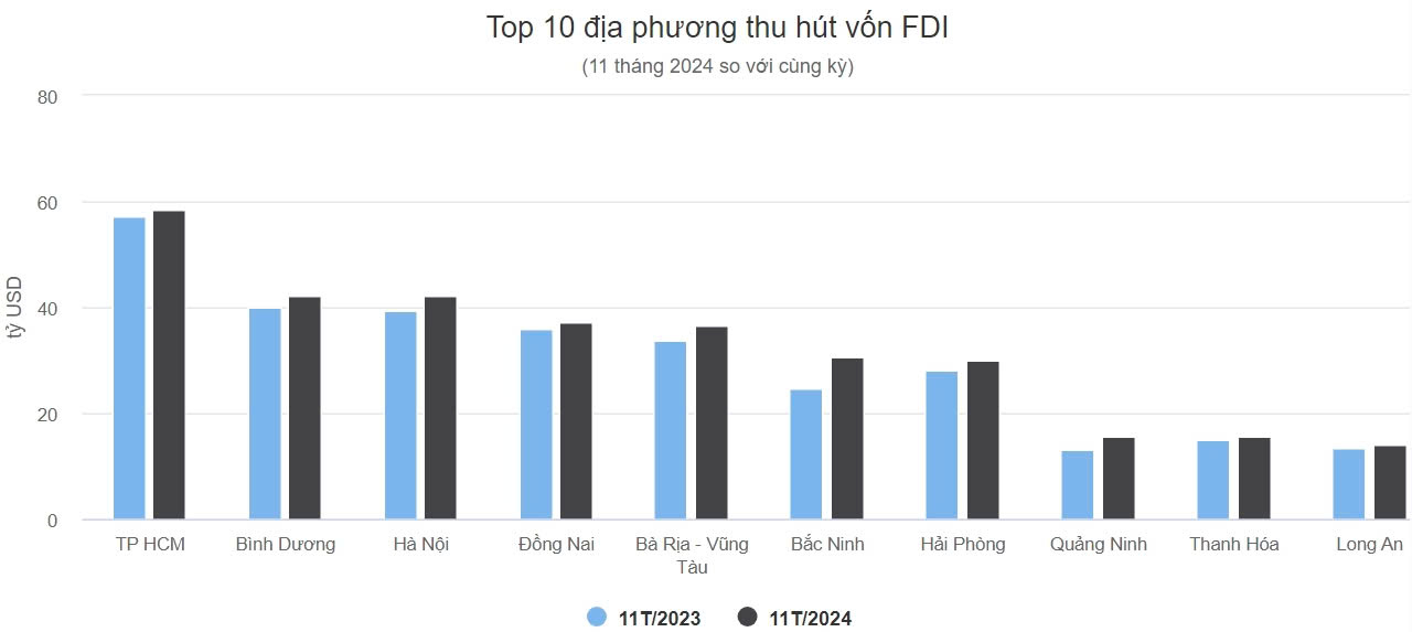 Riêng 11 tháng đầu năm nay, tỉnh này là "nam châm" hút FDI lớn nhất cả nước với 5,04 tỷ USD, tăng gấp 3 lần cùng kỳ.