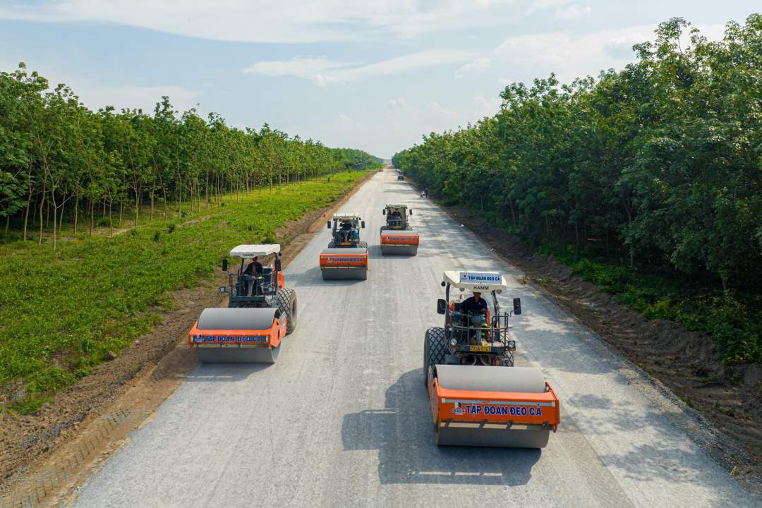 Trên công trường, nhà thầu đã huy động hơn 250 nhân sự cùng 100 máy móc thiết bị triển khai 16 mũi thi công đường và cầu. Đối với phần đường đã thi công xong nền đất, hiện nhà thầu đang thi công lớp móng mặt đường đạt 26/31km, thảm bê tông nhựa đạt 4/31km và dự kiến đến tháng 12.2024 hoàn thành thảm bê tông nhựa.