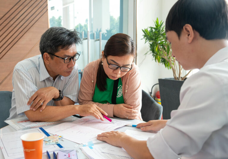 Bà Lê Thị Hạnh – Giám đốc chi nhánh Thành Phố Mới và ông Võ Ngọc Hạnh – Trưởng bộ phận Bàn giao sản phẩm Tập đoàn trao Giấy chứng nhận Quyền sử dụng đất cho khách hàng tại văn phòng Bình Dương