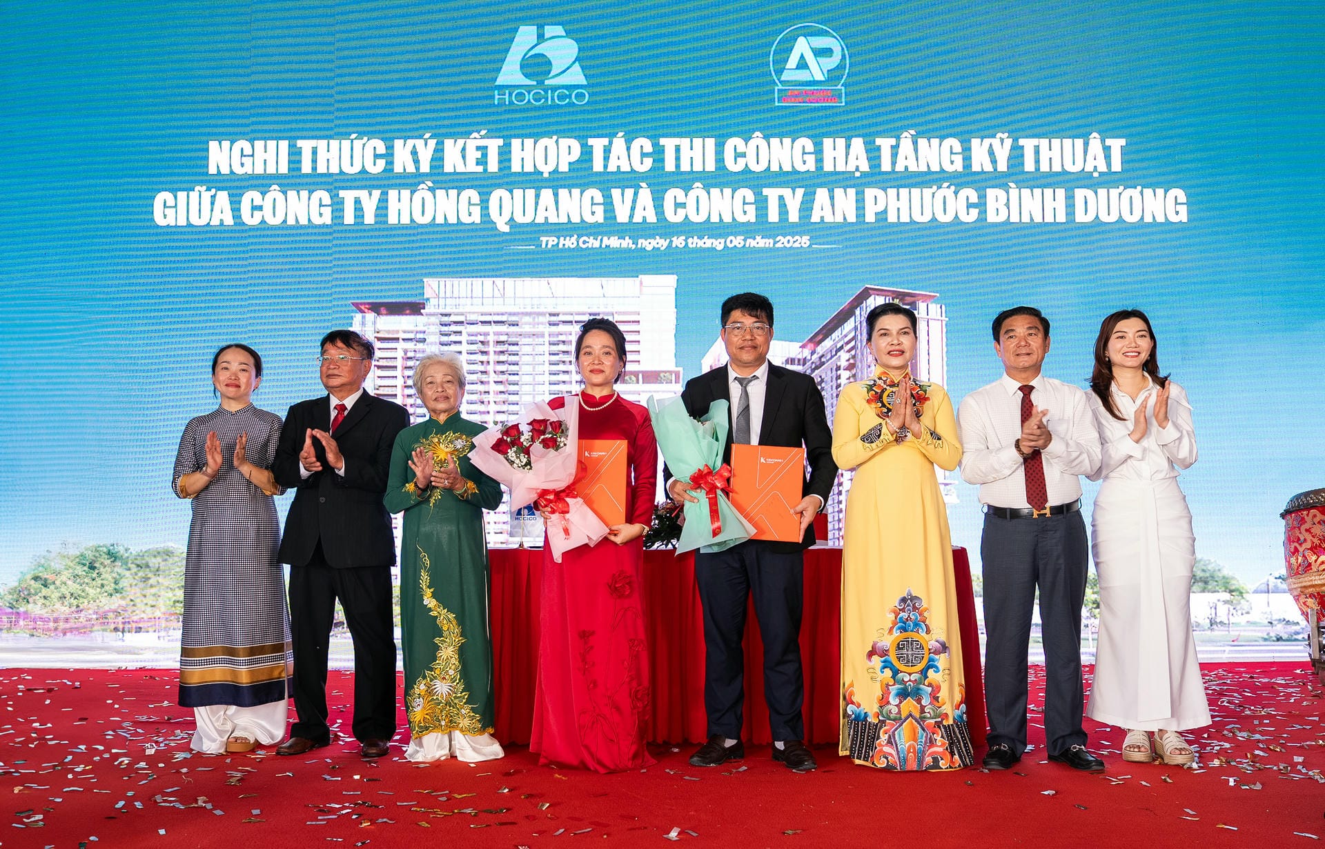 Bà Trương Thị Hồng Hà (trái) và ông Nguyễn Thái Hồ (phải) – Tổng giám đốc Công ty cổ phần Xây dựng An Phước Bình Dương – chụp hình lưu niệm với lãnh đạo hai đơn vị sau khi thực hiện nghi thức ký kết hợp tác. Theo đó, Công ty An Phước Bình Dương sẽ triển khai xây dựng các hạng mục hạ tầng kỹ thuật của Lô 13A thuộc khu chức năng số 13 khu đô thị mới Nam TP.HCM gồm: đường giao thông, thoát nước mưa, nước thải, trạm xử lý nước thải, cấp nước, cấp điện, thông tin liên lạc, công viên cây xanh, kè bờ sông, cầu Mã Voi 1 và Cầu Mã Voi 2.