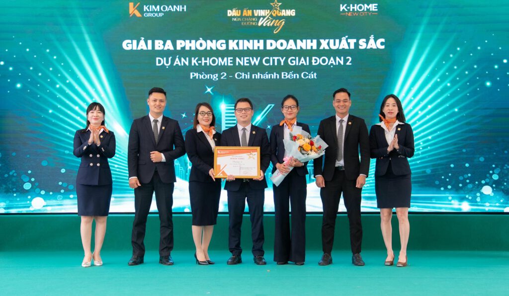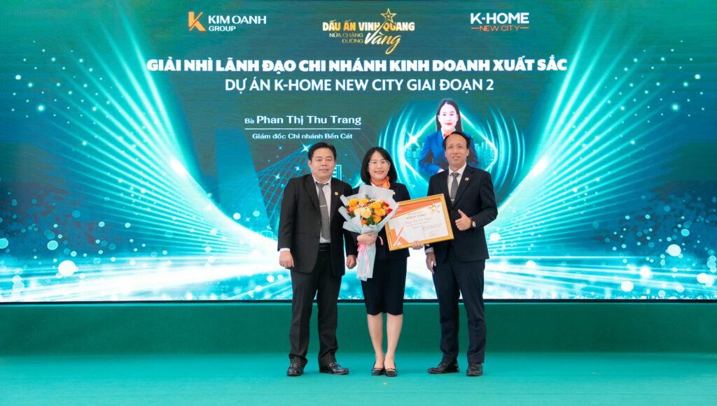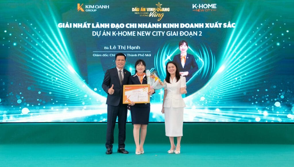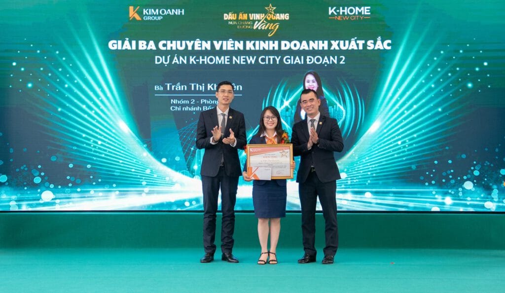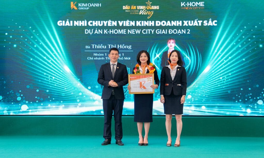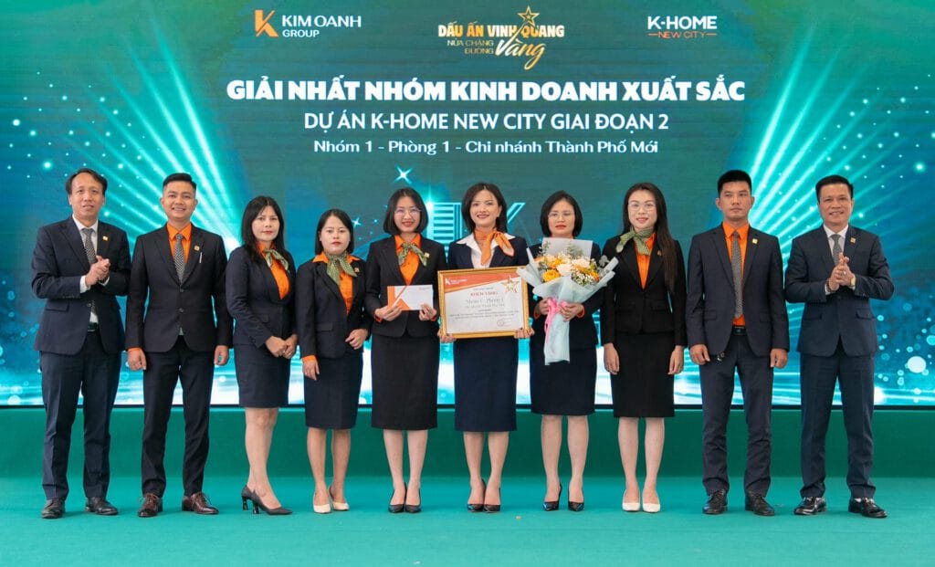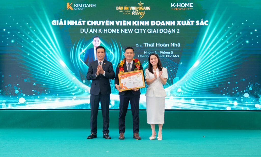Là dự án trọng điểm của năm 2025, K-Home New City đã đóng góp quan trọng vào kết quả kinh doanh nổi bật của Kim Oanh Group trong nửa đầu năm. Chỉ sau ba tháng ra mắt, các chiến binh kinh doanh Kim Oanh Group đã chinh phục thị trường ngoạn mục với 1.035 sản phẩm được giao dịch thành công, tạo nên “cơn sốt” mới trên thị trường bất động sản khu Đông Bắc TP.HCM. Trong ảnh: bà Nguyễn Thị Nhung và ông Tô Duy Chinh đã trao Giải Nhất – Chuyên viên kinh doanh xuất sắc dự án K-Home New City giai đoạn 2 cho ông Thái Hoàn Nhã, đến từ Nhóm 2 – Phòng 3 – Chi nhánh Thành Phố Mới.