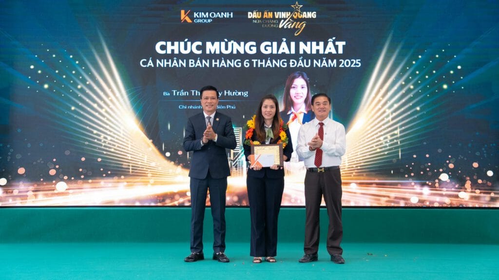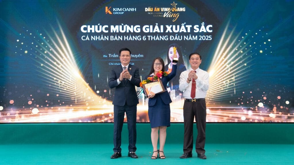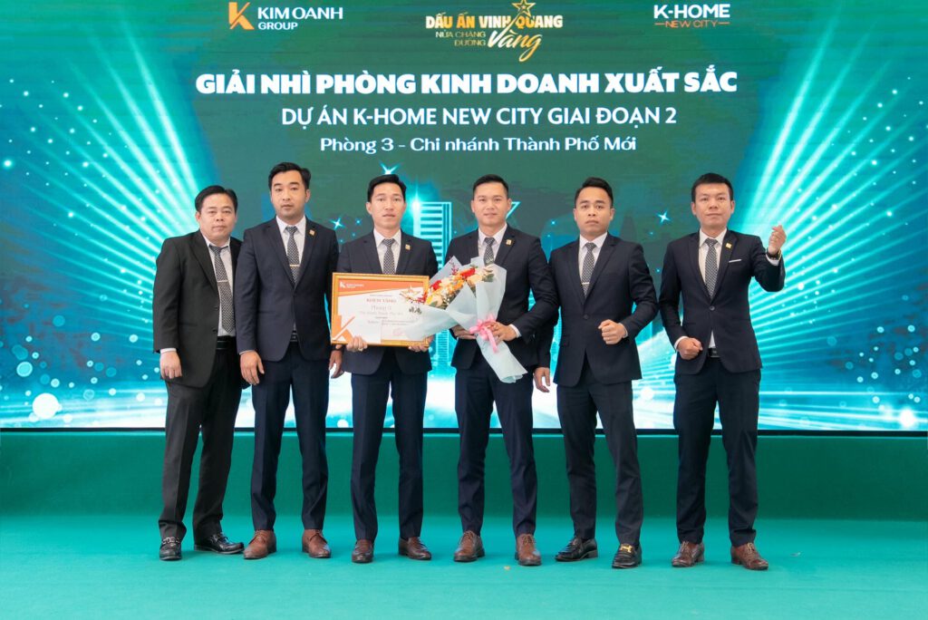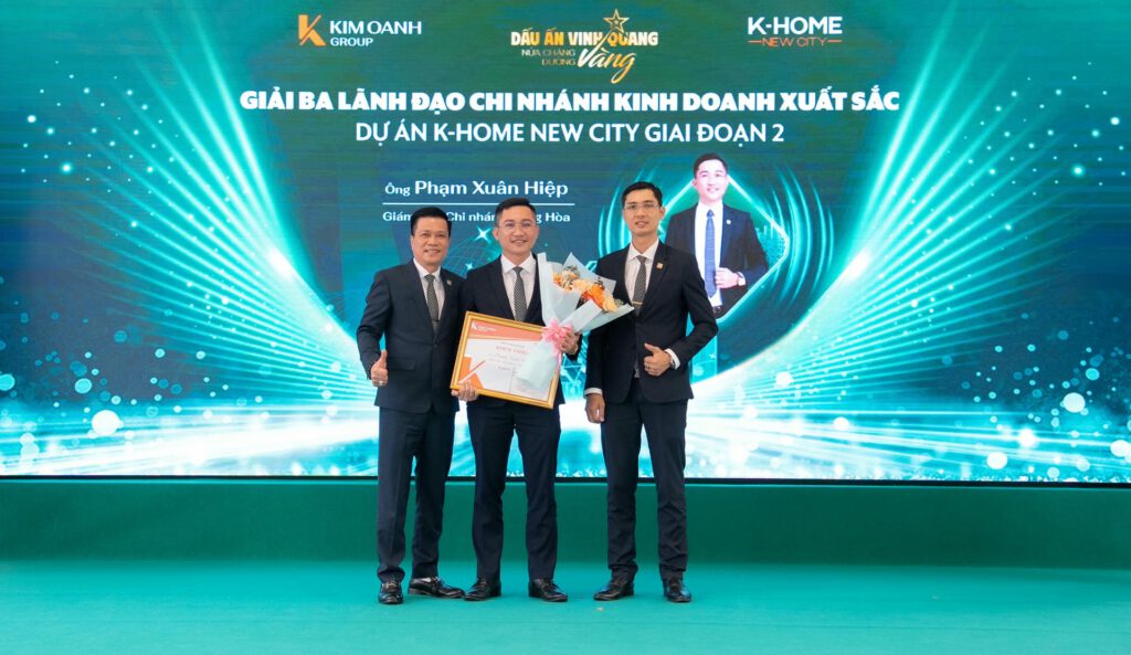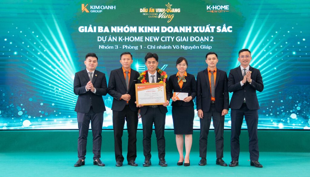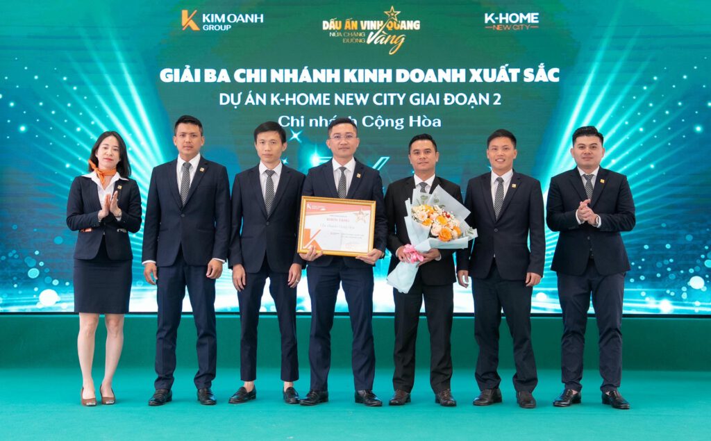 Là dự án trọng điểm của năm 2025, K-Home New City đã đóng góp quan trọng vào kết quả kinh doanh nổi bật của Kim Oanh Group trong nửa đầu năm. Chỉ sau ba tháng ra mắt, các chiến binh kinh doanh Kim Oanh Group đã chinh phục thị trường ngoạn mục với 1.035 sản phẩm được giao dịch thành công, tạo nên “cơn sốt” mới trên thị trường bất động sản khu Đông Bắc TP.HCM. Trong ảnh: bà Nguyễn Thị Nhung và ông Tô Duy Chinh đã trao Giải Nhất – Chuyên viên kinh doanh xuất sắc dự án K-Home New City giai đoạn 2 cho ông Thái Hoàn Nhã, đến từ Nhóm 2 – Phòng 3 – Chi nhánh Thành Phố Mới.