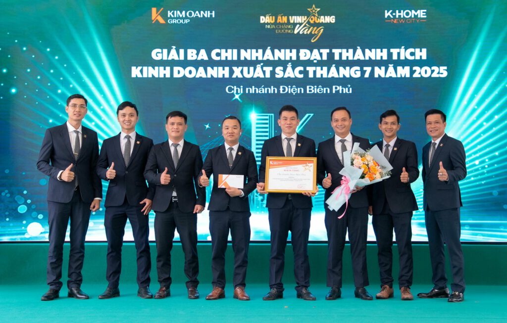 Tiếp nối hành trình ấn tượng của nửa đầu năm, Khối Kinh doanh Kim Oanh Group tiếp tục giữ vững phong độ và tinh thần bứt phá trong quý 3-2025, liên tiếp chinh phục những cột mốc mới với nhiều kết quả đáng tự hào. Trong ảnh: Chi nhánh Thành Phố Mới được vinh danh với Giải Nhất – Chi nhánh kinh doanh xuất sắc tháng 7-2025.