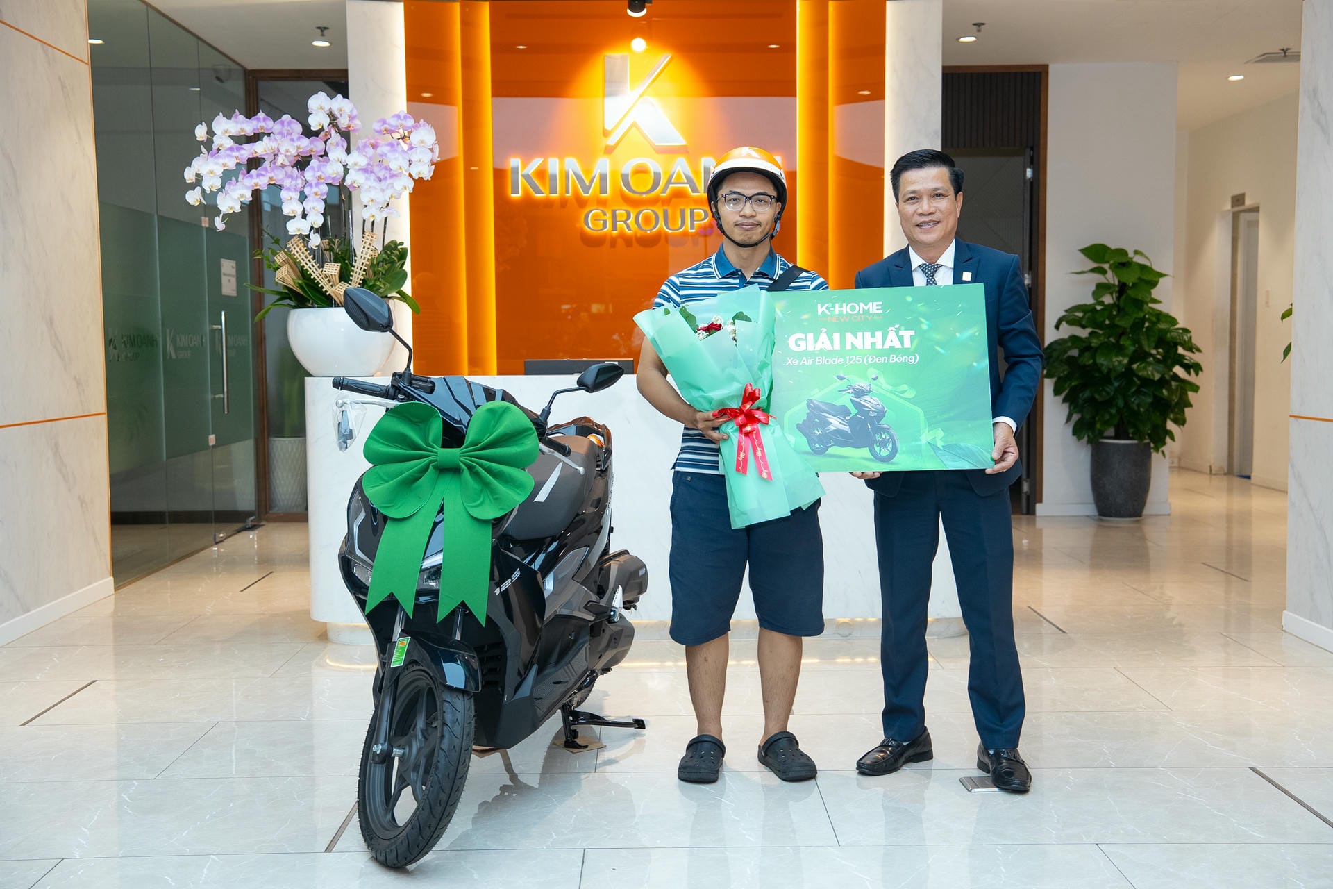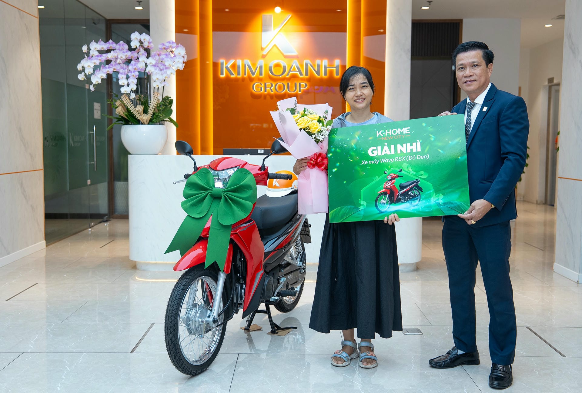 Ông Tô Duy Chinh – Giám đốc Khối Kinh doanh Kim Oanh Group trao Giải Đặc biệt là 1 chiếc xe máy Honda SH cho chị Lê Huỳnh Ngọc Trâm. Chị Lê Huỳnh Ngọc Trân vui mừng chia sẻ: “Đây là niềm vui bất ngờ với gia đình tôi. Cảm ơn Kim Oanh Group đã tạo điều kiện và có nhiều chính sách hỗ trợ để chúng tôi có thể dễ dàng sở hữu tổ ấm tại K-Home New City. Phần quà này như tiếp thêm động lực cho chúng tôi chờ đợi ngày dọn về nhà mới.”