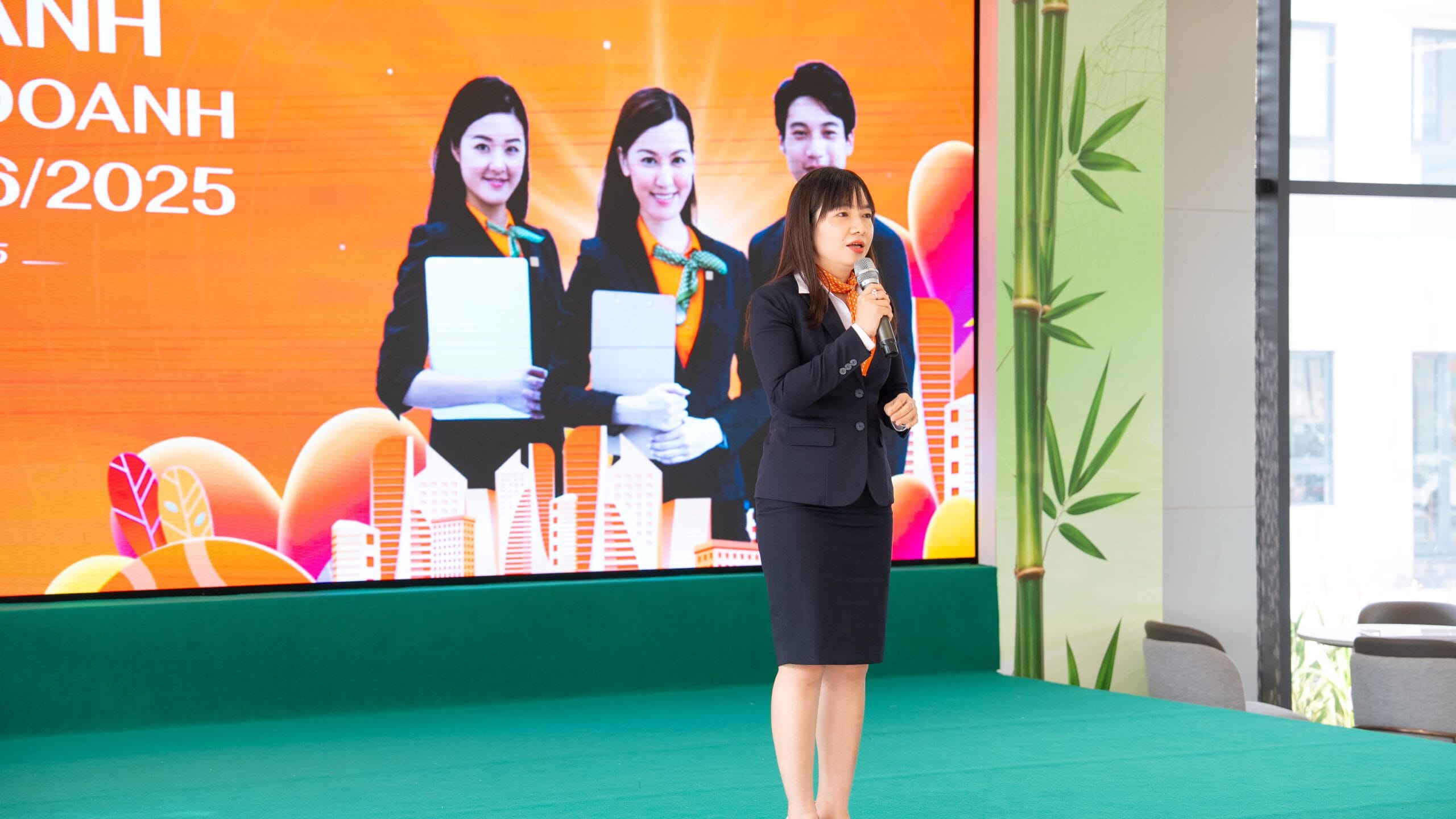 Ông Bùi Anh Đức trao giải Ba chi nhánh kinh doanh xuất sắc của tháng 5 cho chi nhánh Võ Nguyên Giáp.