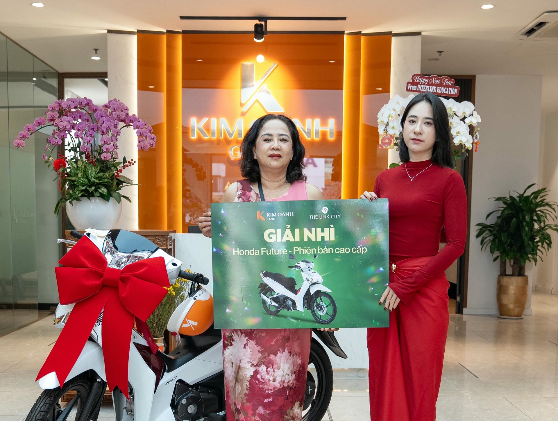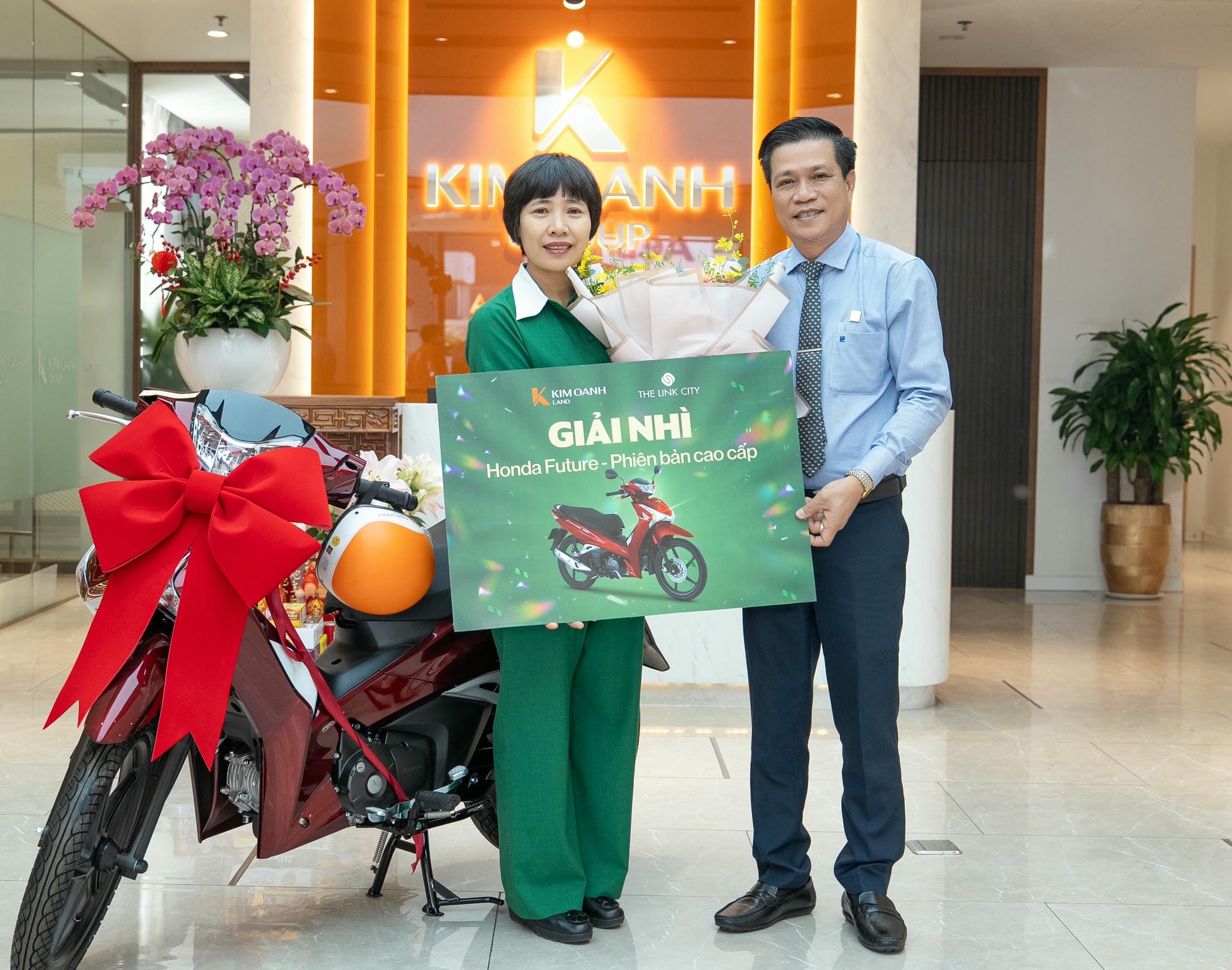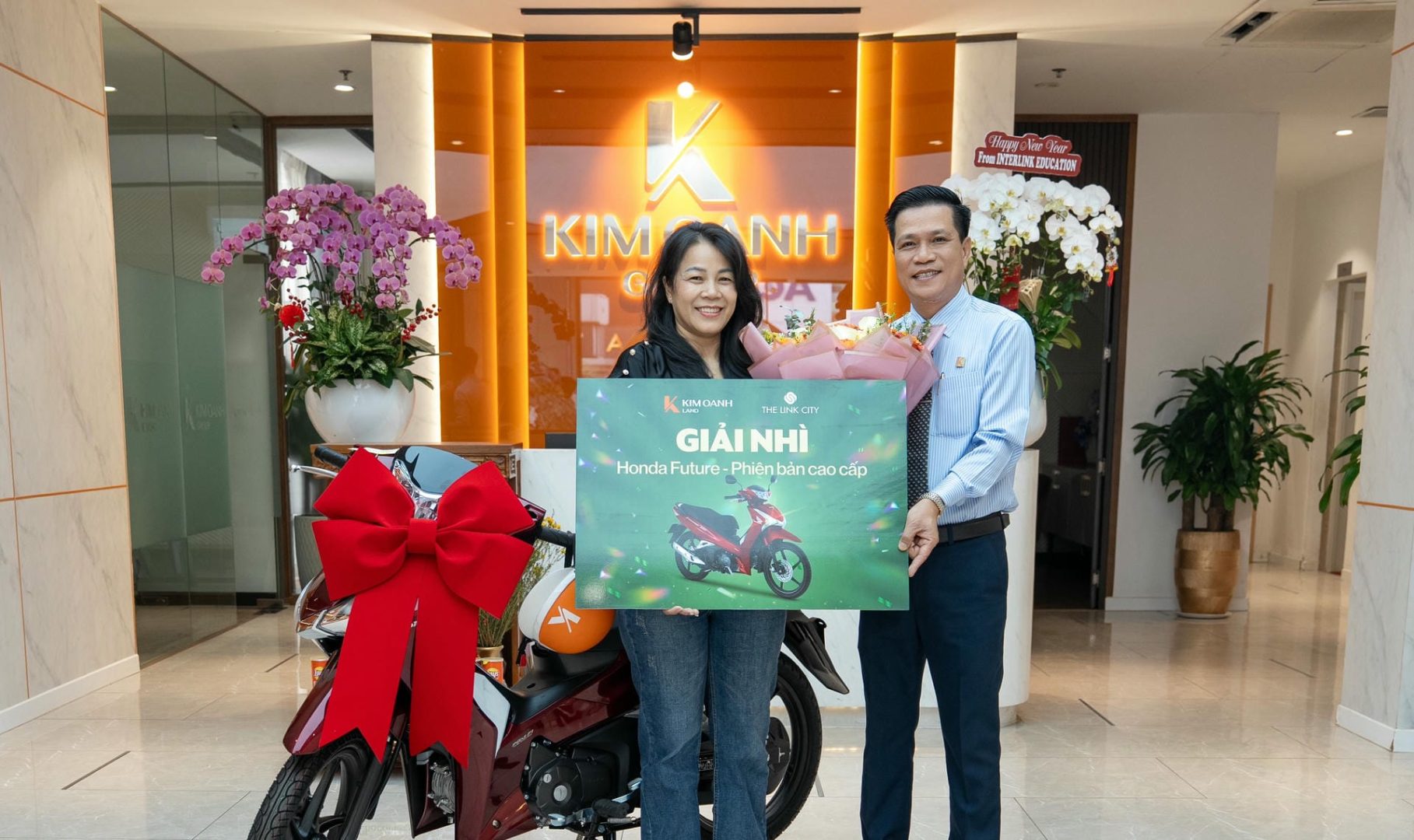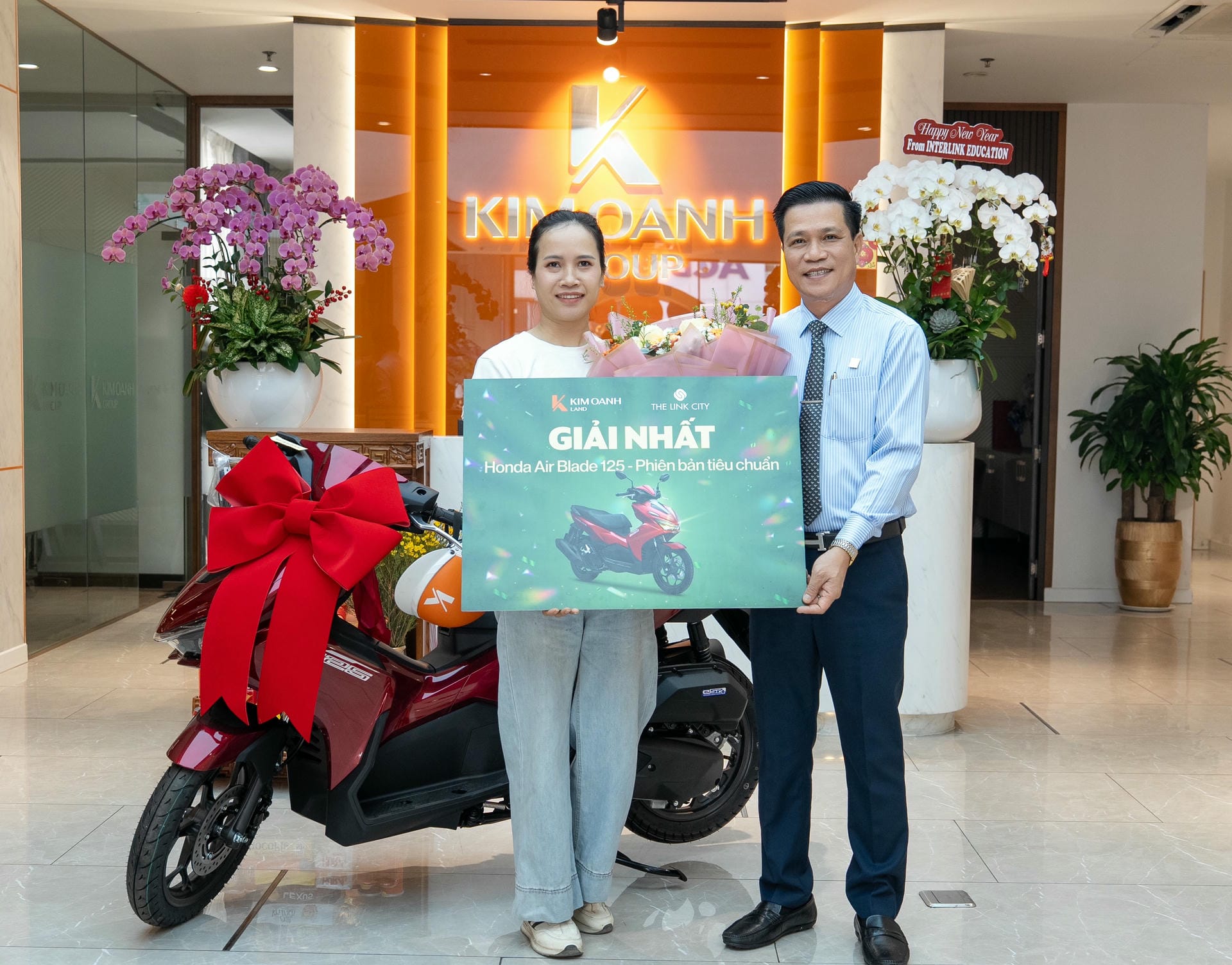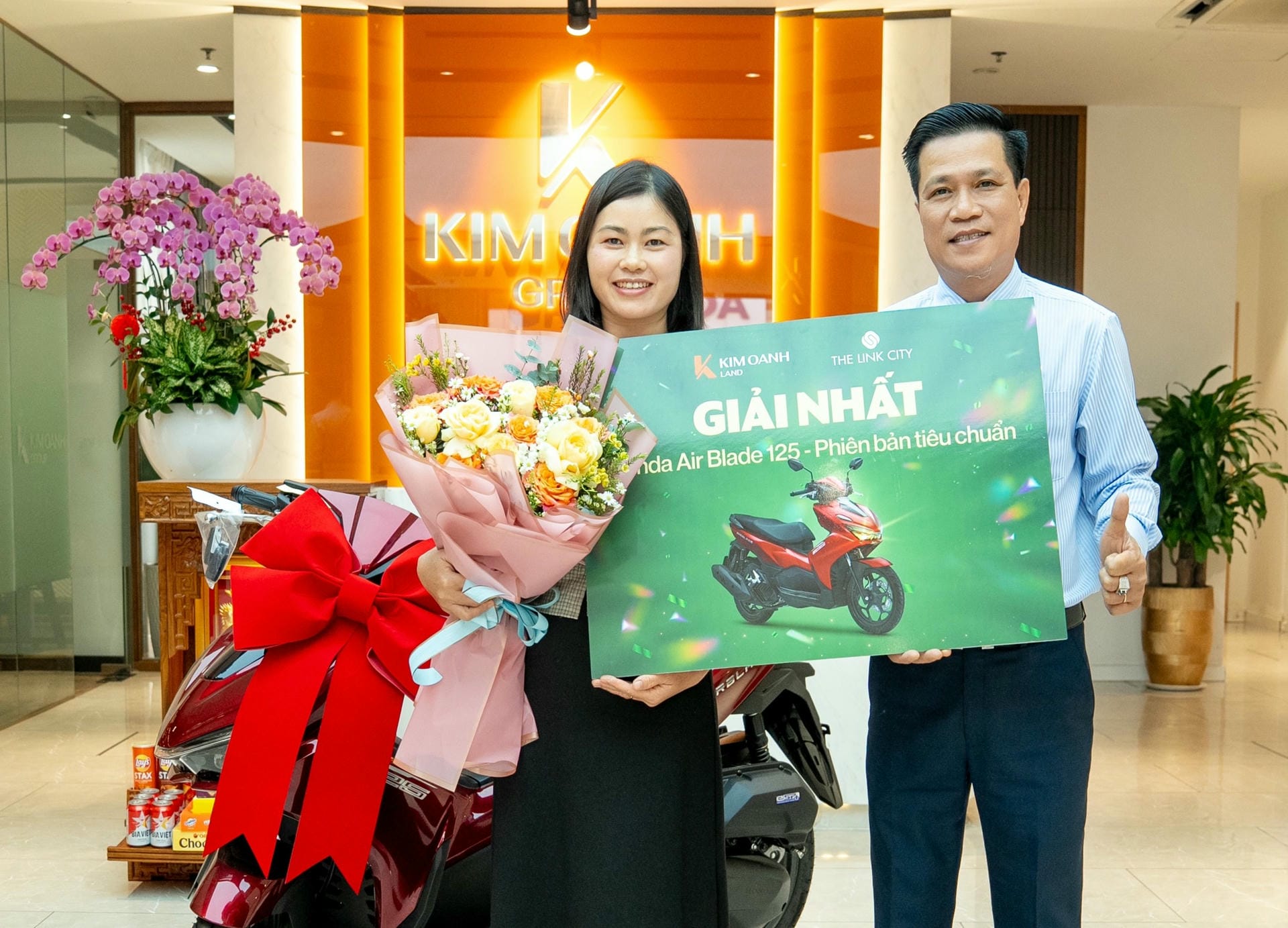 Khách hàng Đàm Thị Ngân Hàng nhận giải Nhất là chiếc xe Honda Air Blade (phiên bản tiêu chuẩn) từ Tô Duy Chinh – Giám đốc Khối Kinh doanh. Chị chia sẻ niềm vui khi nhận giải: “Tôi tìm hiểu dự án The Link City khá kỹ và đã chọn được sản phẩm ưng ý. Bây giờ lại được trao giải thưởng với giá trị lớn nên niềm vui nhân đôi. Xin cảm ơn và chúc Kim Oanh Land ngày càng vững bước thành công, cung cấp cho thị trường ngày càng nhiều dự án tốt hơn nữa”